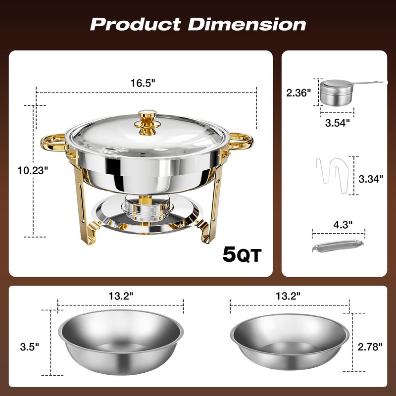- Party Size, Any-Event Ready: With a capacity of 5 quarts, the gold chafers and buffet warmers set is ideal for parties, weddings, catering, and other events. Generously serves 5+ guests with main courses, hearty side dishes, flavorful salads, and more
