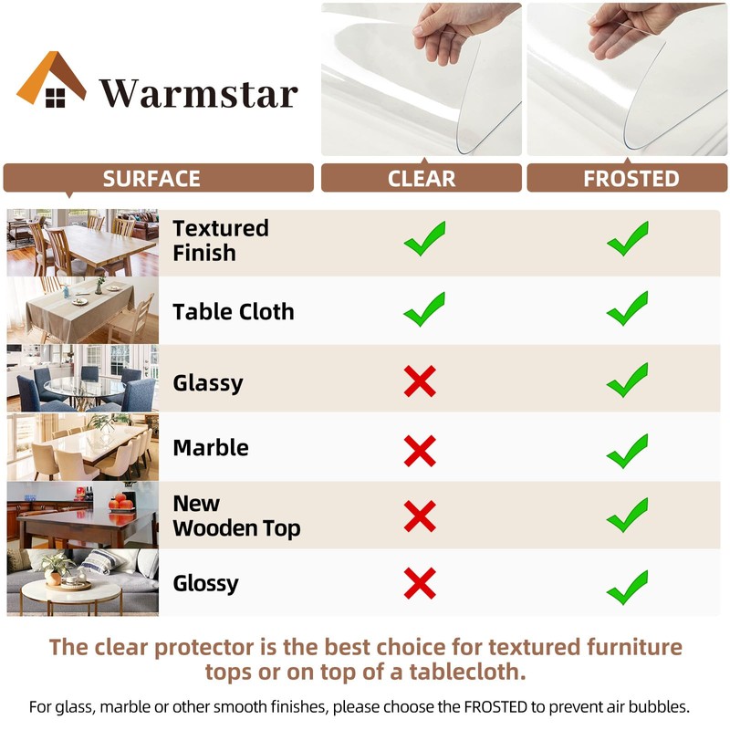 - BEST PROTECTION: Warmstar clear table cover protector not only protect your table tops, tablecloths and expensive furniture from scratches, spills, nicks, oil stains, scalds and more. It can also show the delicacy of your table and provide more protection for ancient and precious furniture.