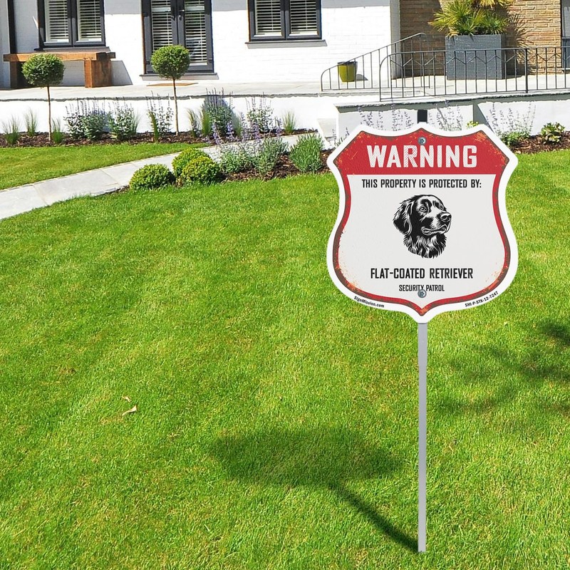 Warning This Property is Protected by Flat-Coated Retriever 12 inch X 12 inch Shield Shaped Rust-Free Aluminum Metal Sign with Aluminum Mounting Stake Weather Resistant Made in the USA