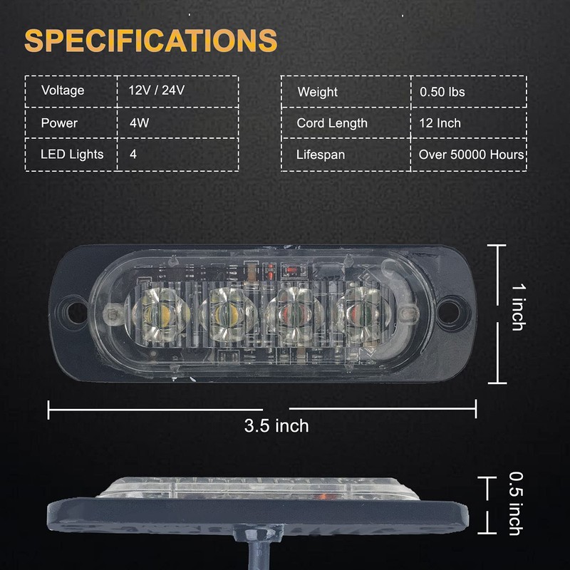 With 4 powerful 1 Watt LEDs, it packs a big punch in a tiny package. The case is sealed tight to prevent moisture build-up and durable enough to take a beating. These compact universal light heads pair well with overhead warning lights and roof-mounted lights.