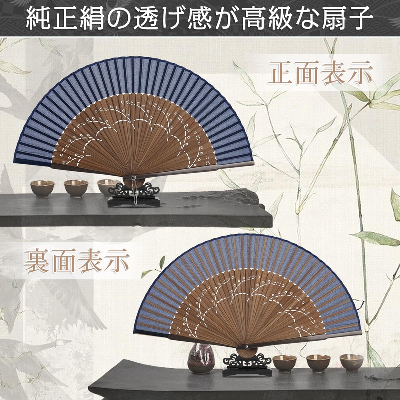 - Material: The fan frame is made of reeded bamboo and the fan side is made of silk fabric. This allows the folding fan to be of superior quality while maintaining its natural beauty and sophistication