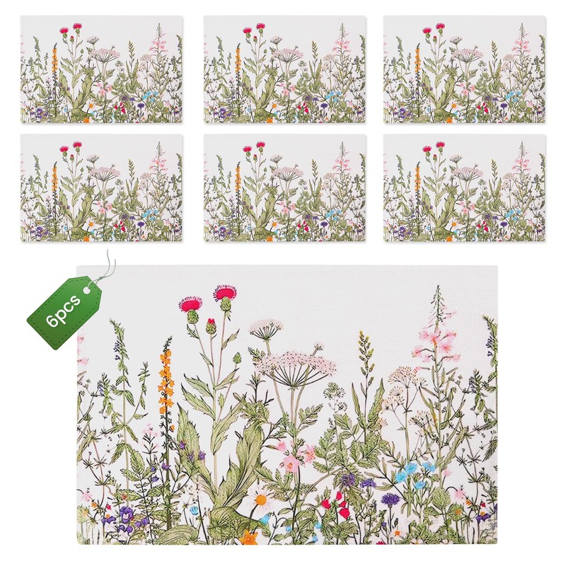 Washable Place Mats, Set of 6 Placemats, 30 x 45 cm Linen Placemat with Flowers and Plant Pattern, Washable Place Mats for Dining Room and Kitchen, Table Decoration