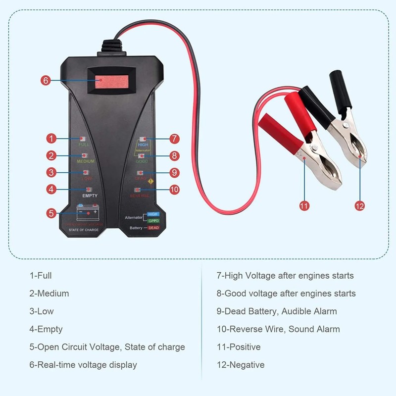 1. Portable 12V battery tester is designed for car, boat and motorcycle. Quick way to get 12V battery status, check if one battery should be replaced or require jump.