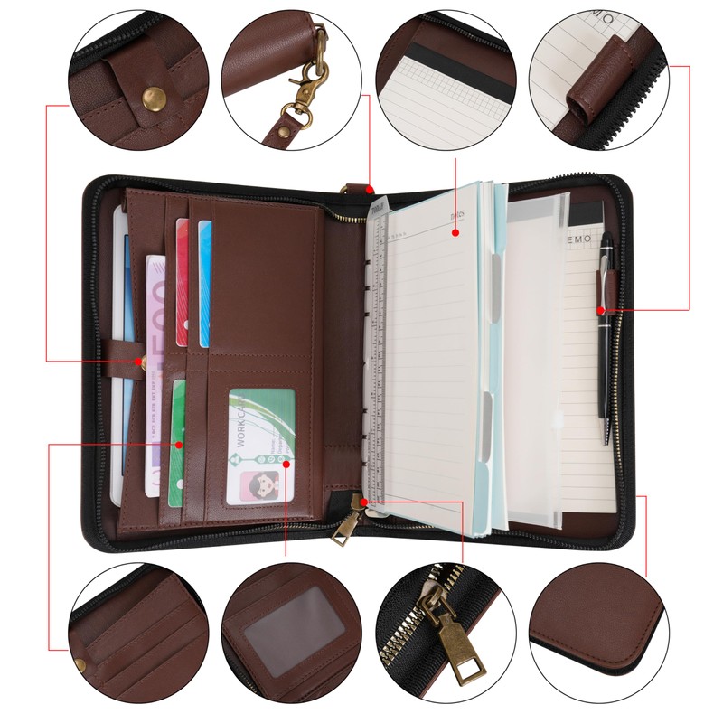 - PRACTICAL ACCESSORIES - Multiple dedicated card slots, document pockets, and pen holders keep all essentials neatly arranged. Includes 160 pages of refillable journal paper, 50-page ruled writing pad, clipboard with 6-ring binder, index dividers, bookmark, pen, and zipper pouch/cardholder. Functions as a portfolio folder, notepad holder, and leather folder all in one.