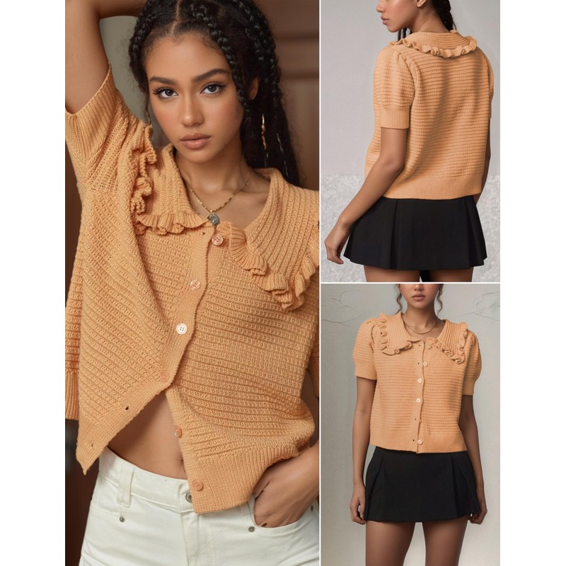 Watashi Womens Short Sleeve Cardigan Casual Button Down Ruffle Collared Lightweight Knittwear Summer Sweater Top (Orange-XS)