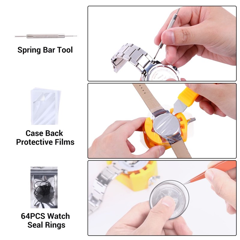 - VERSATILE & MULTIFUNCTIONAL: The Ohuhu watch battery replacement tool comes with three bonus accessories. A spring bar tool, 10 protective films, and 64 watch seal rings. The spring bar tool can help you remove the strap to make the watch case opening easier, while the 10 protective films can protect the dial from scratches during case opening. Finally, the 64 sealing rings of 32 specifications allow for easy replacement of your watch rings if needed.