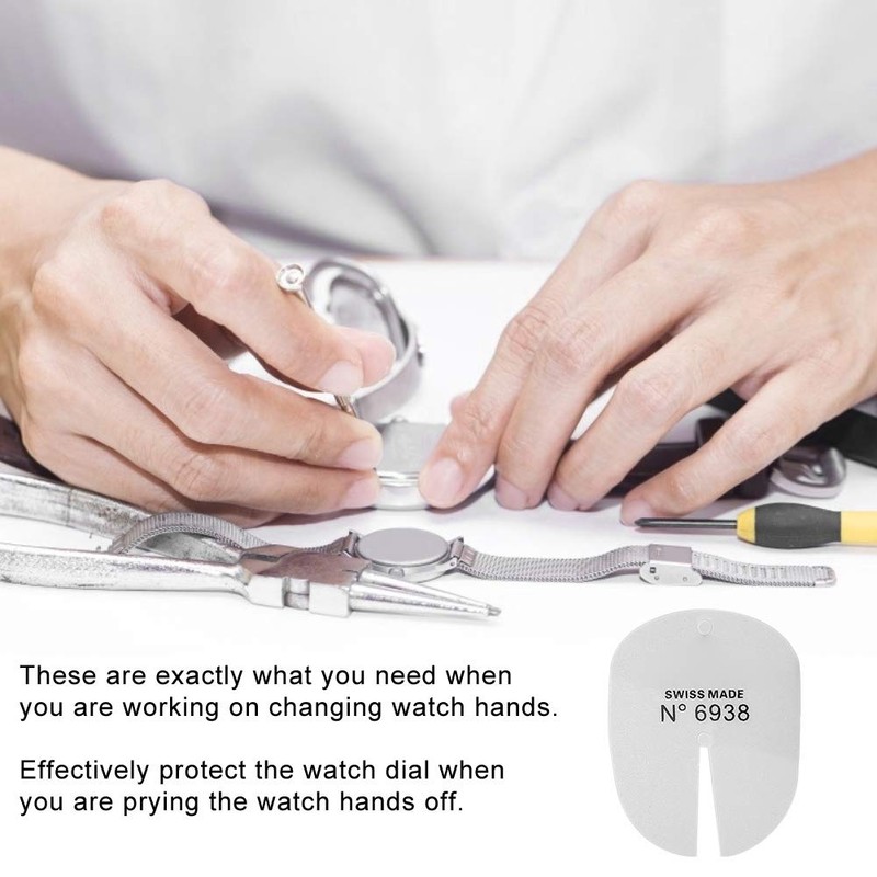 - In order to protect the watch dial when you are prying the watch hands off, just slide one of these thin protectors under the watch hands. With it, you can remove the watch needle without hesitation.