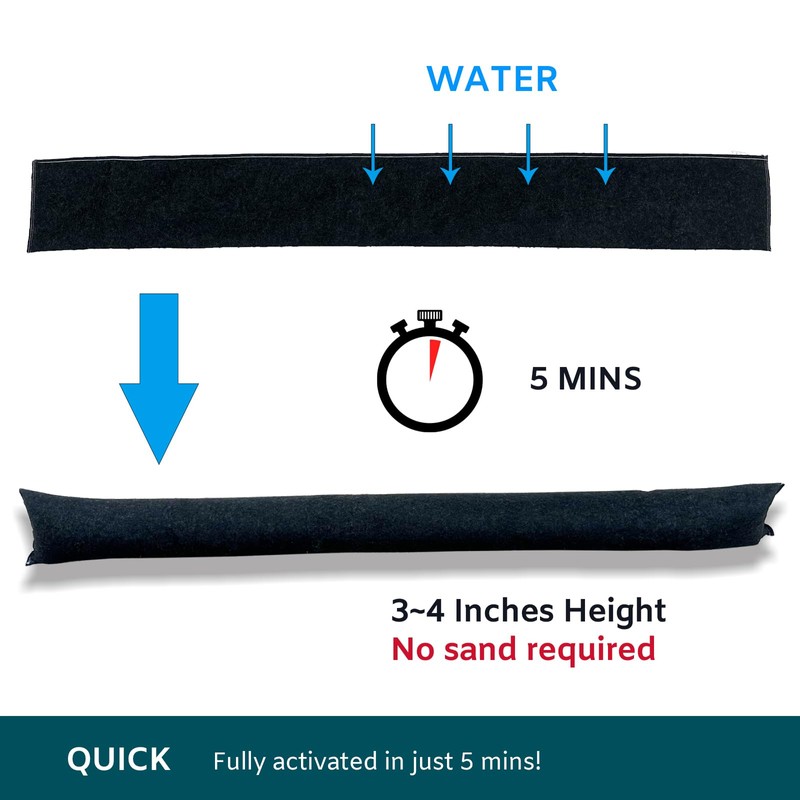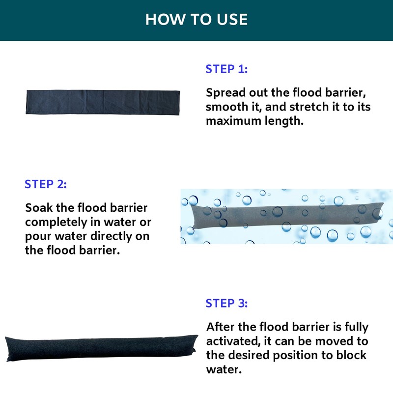 - Application: The water-activated flood barrier for doors can be used to absorb, divert and block water.