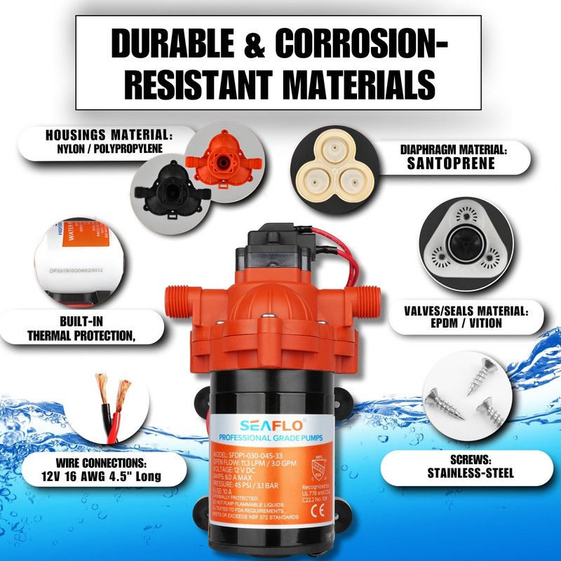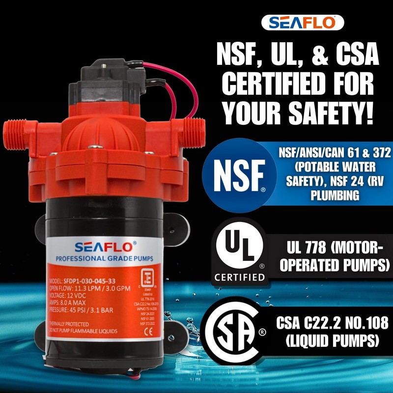 SEAFLO 33 Series 12V DC RV/Camper/Boat/Off-Grid Fresh Water Pressure Pump –12V, 3.0 GPM, 45 PSI, On Demand Self-Priming, Built-In Pressure Switch - NSF, CE & Rohs Certified, UL Listed, 4-Year Warranty