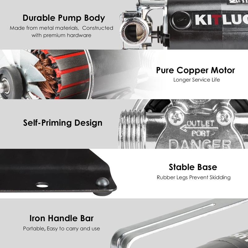 - 【What Included In Kit】 We've included 1*KITLUCK electric water transfer pump, 1*6ft Water Suction Hose, 1*Water Suction Strainer Attachment, Replacement Kit: 1*Extra impeller, 1*Extra Gasket, 2*Carbon Brush for your convince; Comes with a handle to make this pump easy to carry to where you need it.