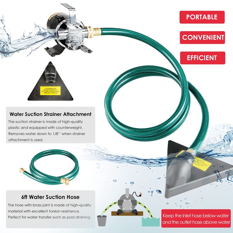 - 【Efficient Drainage】 KITLUCK portable water pump includes 6 feet suction hose and water suction strainer attachment. The suction strainer is made of high-quality plastic and equipped with counterweight. Removes water down to 1/8' of the surface when the water suction strainer attachment is used, ideal for cleaning or sewage. The hose with brass hose joint is made of high-quality material with excellent torsion resistance.