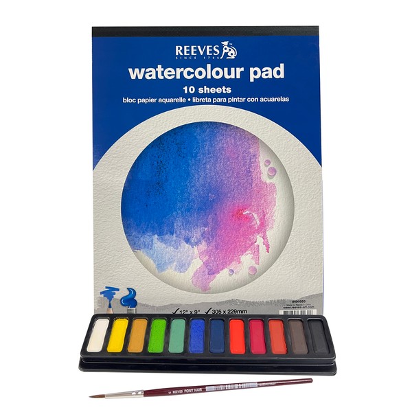 This watercolor art set from Reeves, a company that has made quality art products since 1766, is designed for the beginning artist. Included in the set are all the basics with 12 colorful watercolor cakes, a quality round paintbrush, a 10 sheet pad of 12" X 9" acid-free watercolor paper and an instruction leaflet. The paints have good color strength, good lightfastness and permanence.