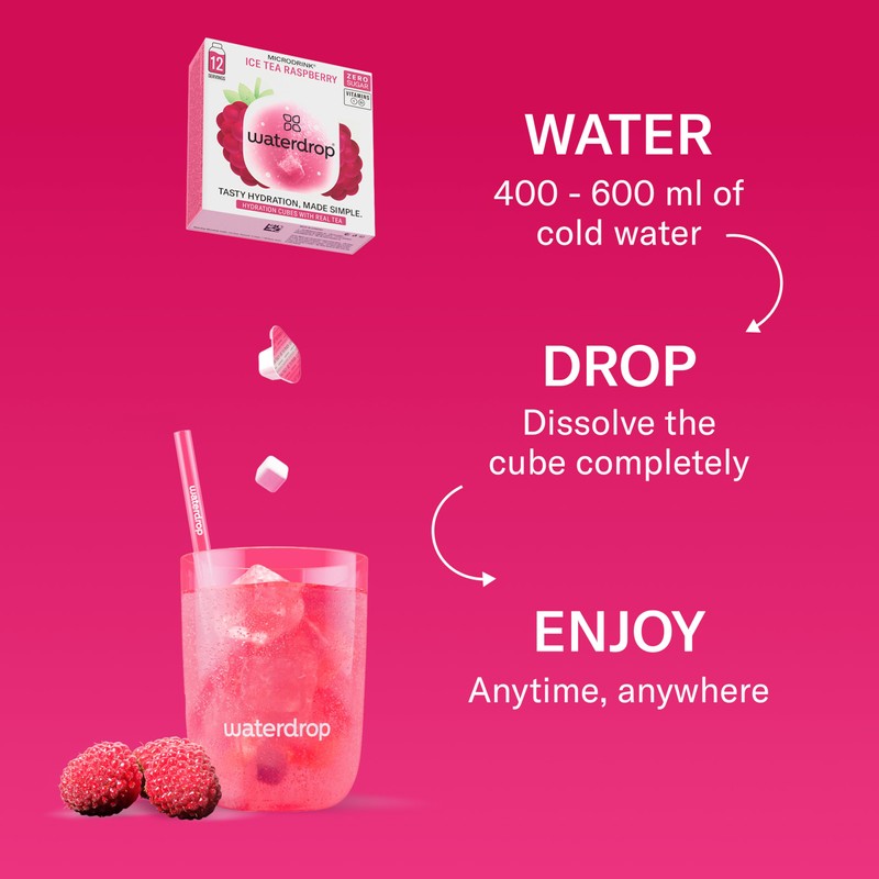 - TEA IT YOUR WAY: Simply add one cube to 400-600ml of cold water, wait until it dissolves and enjoy a raspberry flavoured ice tea anytime, anywhere. Feel free to use either still/sparkling or more/less water to customise your ICE TEA experience!