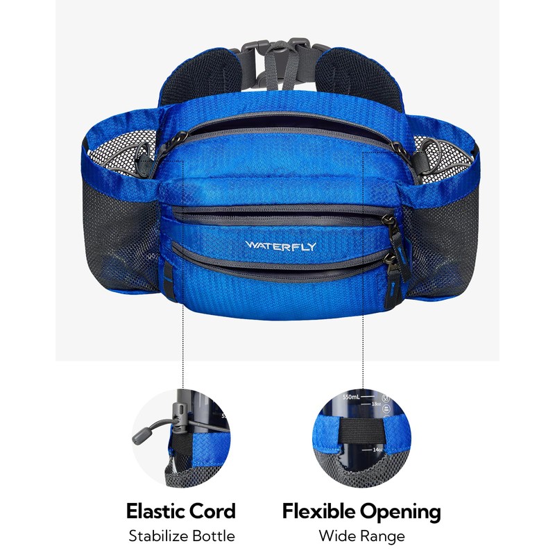 - 2 portabotellas de agua: botellas no incluidas. Diseñado con 2 bolsillos de malla en ambos lados para sus botellas de agua, puede llevar suficiente agua con esta riñonera mientras camina, mientras que la boca del bolsillo elástica le permite guardar botellas de 400-450 ML (14-16 oz) y 3,1" de diámetro. estable y seguro