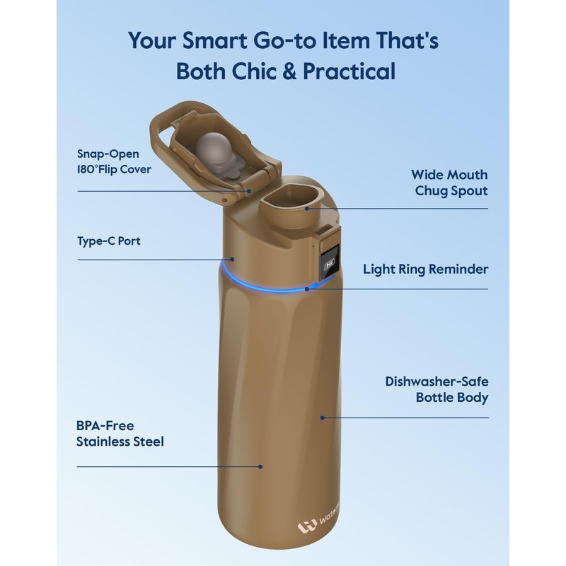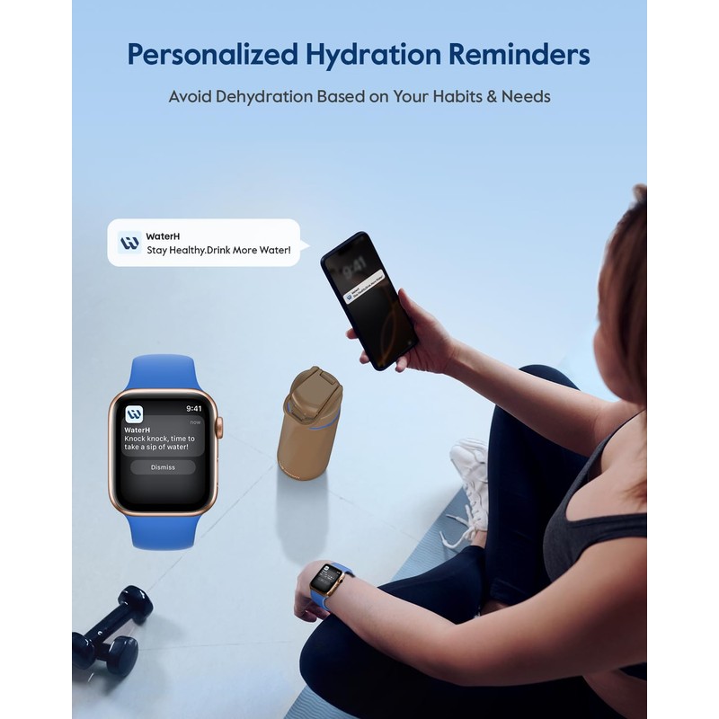 - REMINDER TO REACH GOAL: Our WaterH smart bottle is a game-changer, featuring built-in hydration reminders and tracking capabilities. The light ring on the lid, the LED display, and the notifications on your phone or smartwatch help you avoid the negative effects of dehydration caused by forgetting to drink water—such as dizziness, increased blood pressure, and fatigue. It also helps you reach your wellness goals and develop lasting hydration habits.