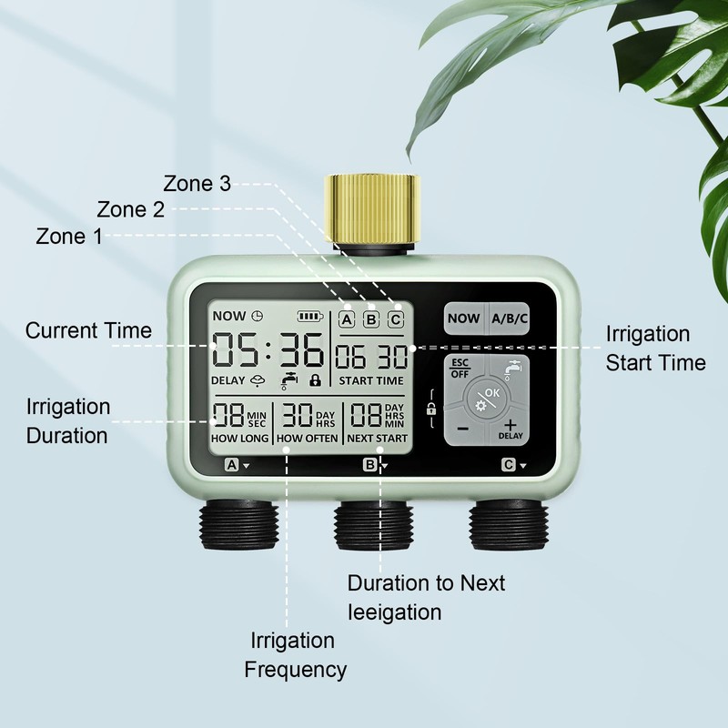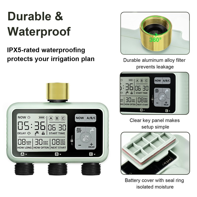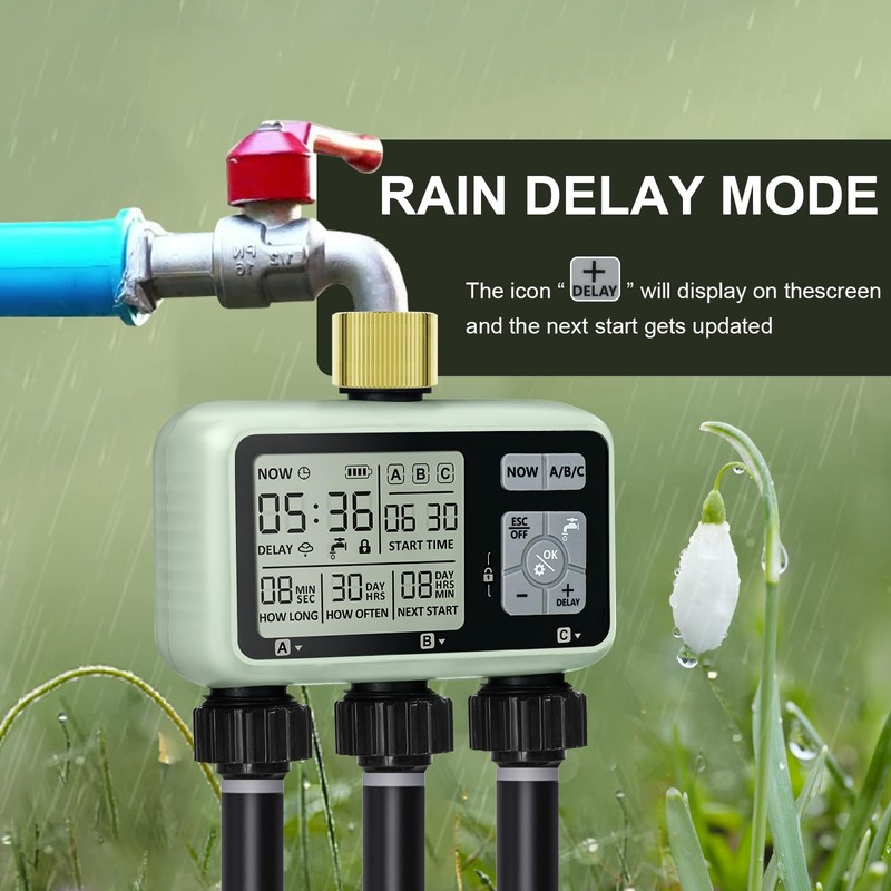- RAIN DELAY & CHILD-LOCK MODE & MANUAL MODE: This water timer with rain delay function can be used flexibly during rainy season to prevent over watering, saving you water and keeping your plants healthy. With child-lock mode, it can effectively prevent accidental triggering by children and pets and prevent water wastage. Manual mode allows you to use irrigation in real time without interrupting the reserved irrigation routine.