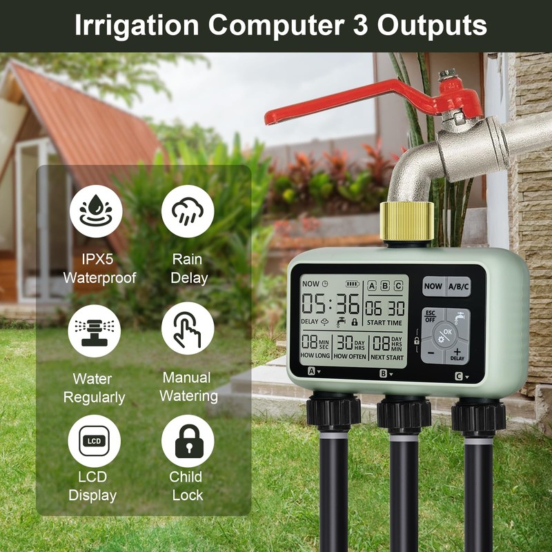 - 3 OUTLET INDIVIDUAL WATERING TIMER: Our sprinkler timer with 3 zones, customizable settings for start time, duration (1 second to 360 minutes) and watering frequency (1 hour to 15 days) for each zone, gives you complete control over watering each zone of your patio and lawn, watering your lawn evenly, efficiently, and easily! Ideal for outdoor drip irrigation, garden hose watering, lawn sprinkler controllers, greenhouse misting systems, pond filling.