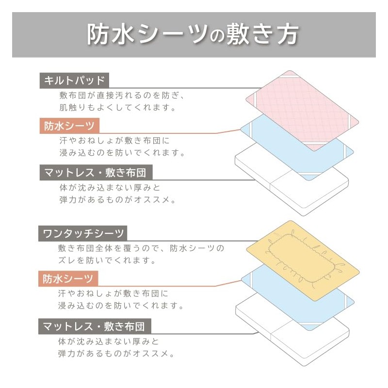 The waterproof sheet is placed between the quilting pad and the duvet so that it absorbs sweat with the sheet and quilting pad, and the moisture does not penetrate into the comforter. Of course, the waterproof sheet can be used for diaper wetting