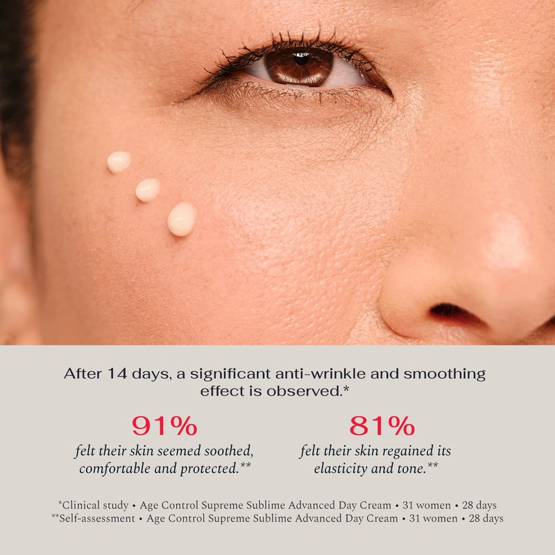 - RESULTS: After 14 days, a significant anti-wrinkle and smoothing effect is observed.* After 14 days,** 93% felt an instant sensation of comfort and suppleness upon application. 91% felt their skin seemed soothed, comfortable and protected. 81% felt their skin regained its elasticity and tone. After 28 days,** 87% felt their skin appeared visibly smoother. 8 in 10 women felt their skin was visibly more radiant. *Clinical study, Age Control Supreme Sublime Advanced Day Cream, 31 women, 28 days. **Self-assessment, Age Control Supreme Sublime Advanced Day Cream, 31 women, 28 days.