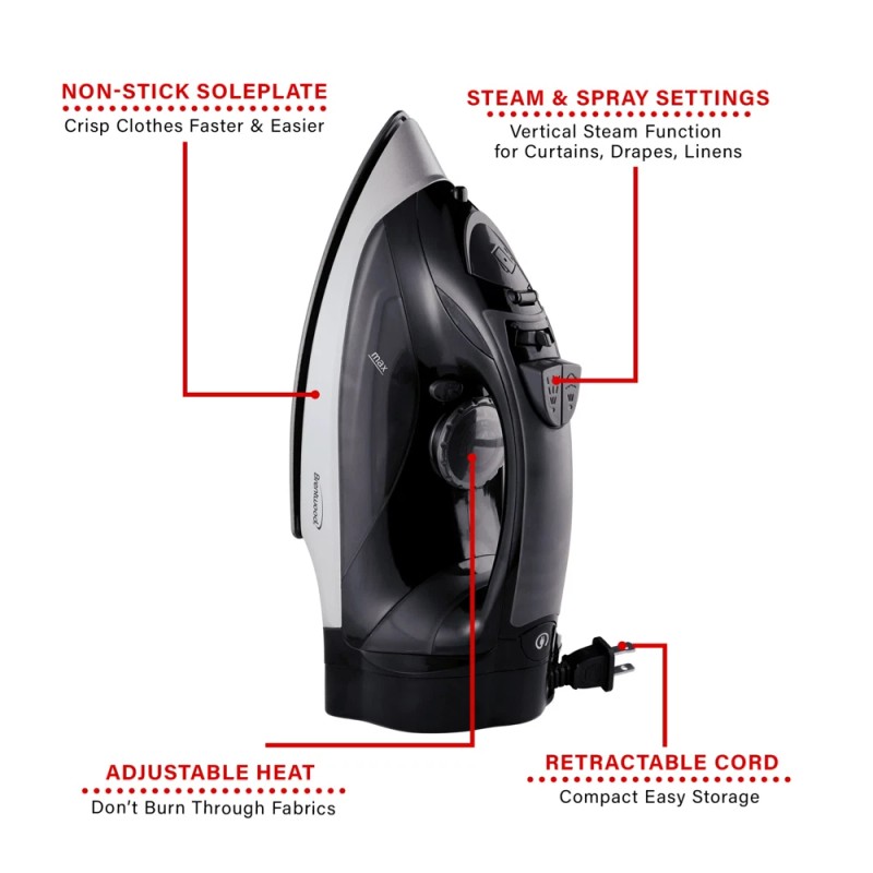 Use the powerful 1200 watt Brentwood MPI-59BK Non-Stick Steam Iron to quickly and efficiently eliminate wrinkles giving your clothes a crisp, polished look. Iron all kinds of fabrics using the fabric selection guide, spray and steam settings. Switch from variable steam to vertical steam to remove wrinkles from hanging curtains, drapes, linens and more. Non-stick coating allows iron to glide across fabrics. Easily refill the steam iron with water and conveniently see how much is left with the see through water compartment. Power indicator light illuminates when the steam iron is turned on. The 7.5 foot cord quickly retracts into the base with the push of a button. Our jet black steam iron accents any home’s décor.