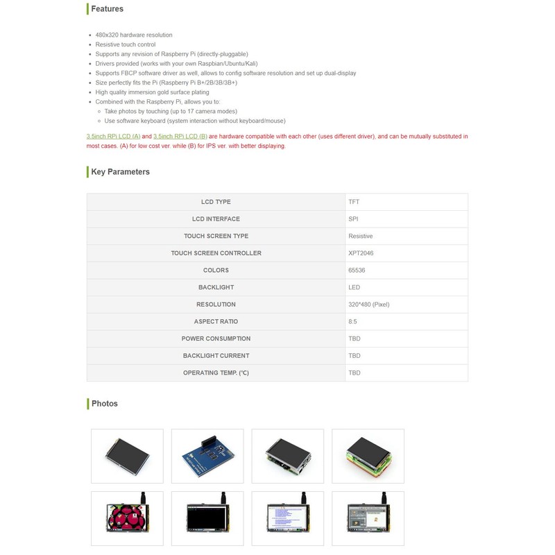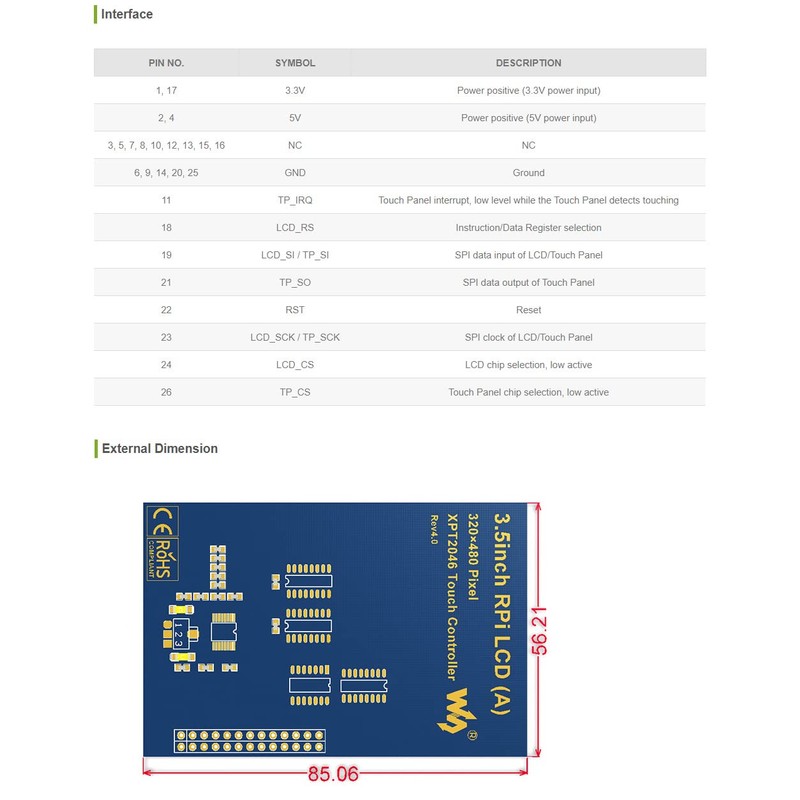 - 480x320 hardware resolution.Resistive touch control Size perfectly fits the Pi (Raspberry Pi B+/2B/3B/3B+/Pi 4B)