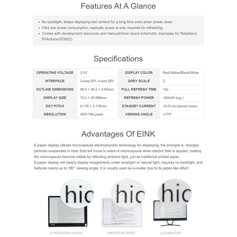 - Doesn't support partial refresh. No backlight, keeps displaying last content for a long time even when power down.