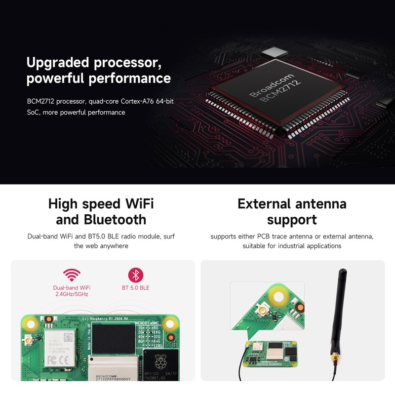 • Faster eMMC Flash storage, up to 200 Mbps data rate Optional for certified radio module, supports either PCB trace antenna or external antenna, more suitable for industrial applications Adopts B to B connectors, most compatible with Compute Module 4