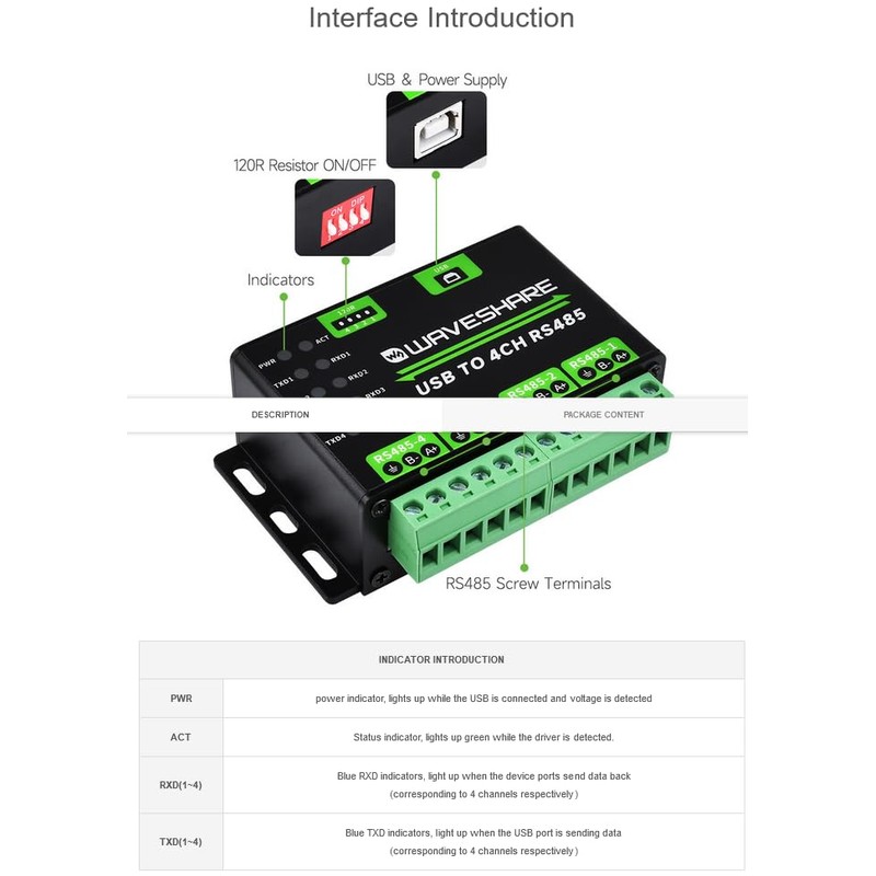 - Módulo de comunicación industrial USB a 4 canales RS485: se extiende USB a 4 canales RS485, permite la comunicación simultánea e no empotrado para cada canal.