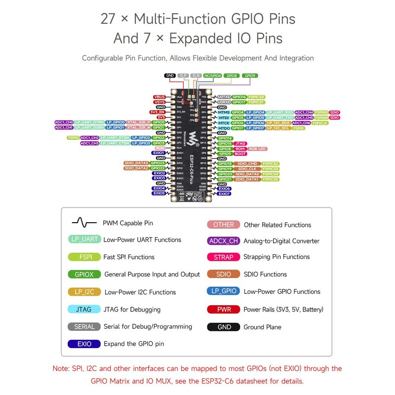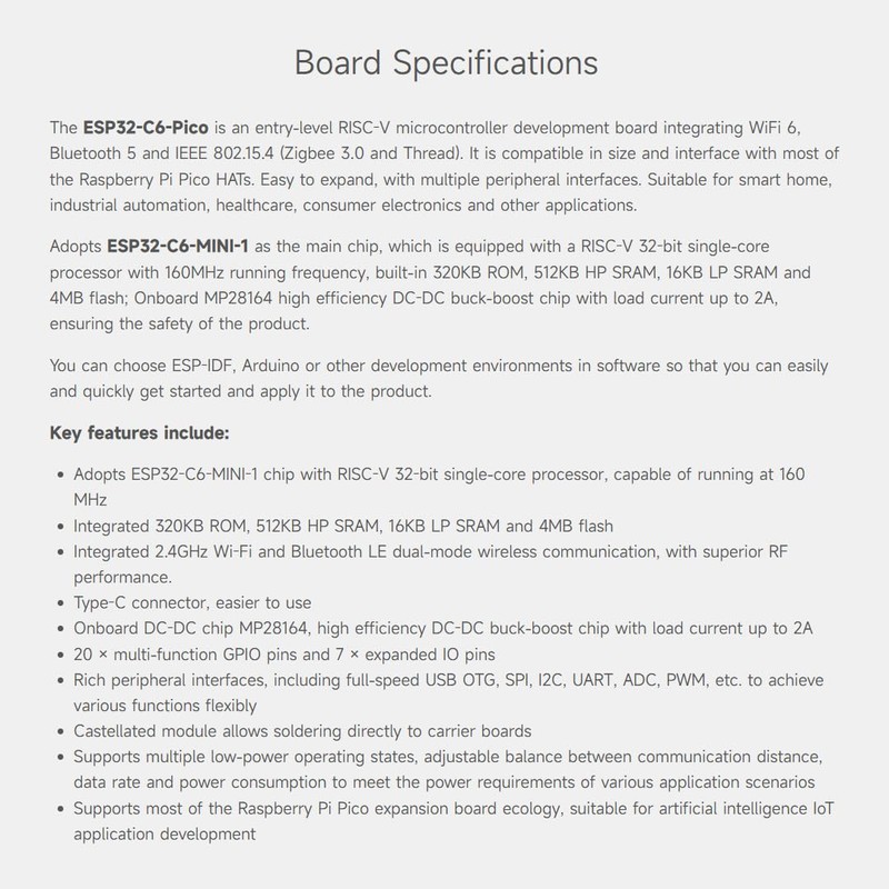 The ESP32-C6-Pico with pre-soldered pin header is an entry-level RISC-V microcontroller development board integrating WiFi 6, Bt5 and IEEE 802.15.4 (Zigbee 3.0 and Thread). It is compatible in size and interface with most of the Raspberry Pi Pico HATs. Easy to expand, with multiple peripheral interfaces. Suitable for smart home, industrial automation, healthcare, consumer electronics and other applications.