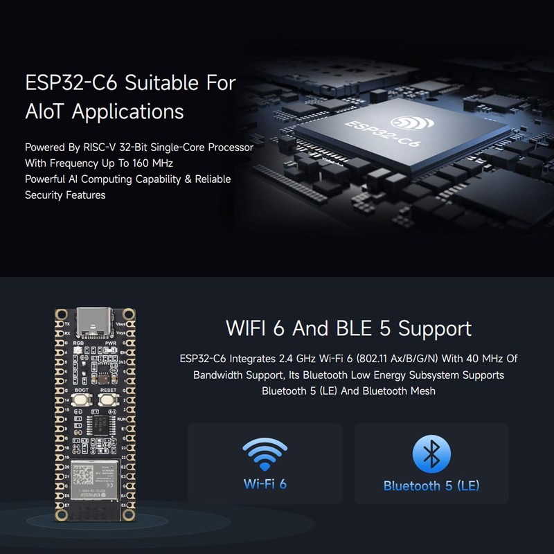 - A ESP32-C6 Microcontroller WiFi 6 Development Board with pre-soldered pin header. Adopts ESP32-C6-MINI-1 chip with RISC-V 32-bit single-core processor, capable of running at 160 MHz. Integrated 320KB ROM, 512KB HP SRAM, 16KB LP SRAM and 4MB flash