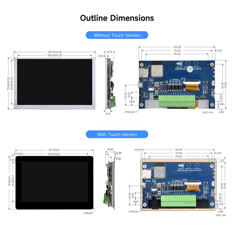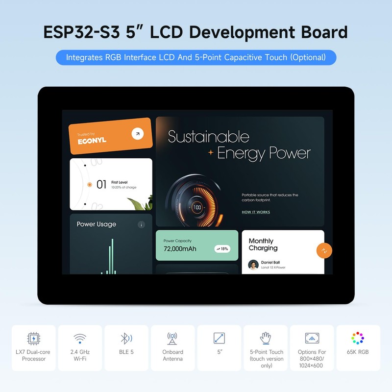 Waveshare ESP32-S3 5inch Display Development Board, 800×480, 32-Bit LX7 Dual-Core Processor, Up to 240MHz Frequency, Supports WiFi & Bluetooth, with Onboard Antenna, No Touch
