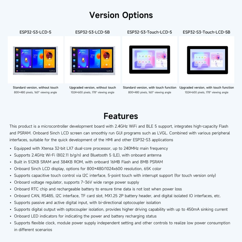 - Memory & Storage: Equipped with 512KB SRAM, 384KB ROM, 16MB Flash, and 8MB PSRAM for ample storage and smooth execution of applications.