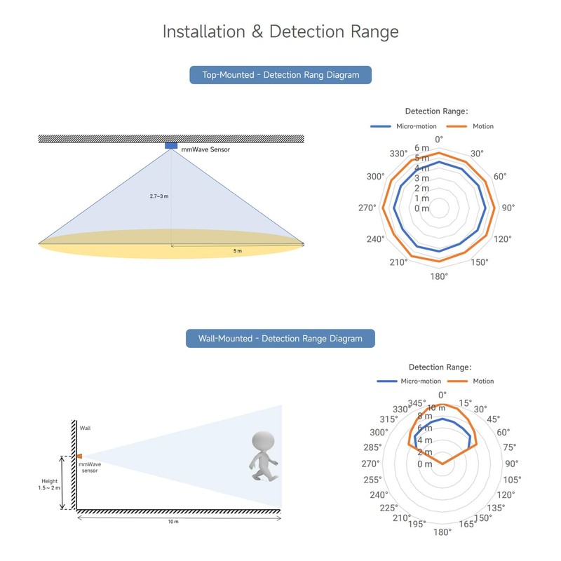 - Onboard MCU and built-in human micro-motion sensing algorithm for accurate detecting of moving, micro-motion, and standing human