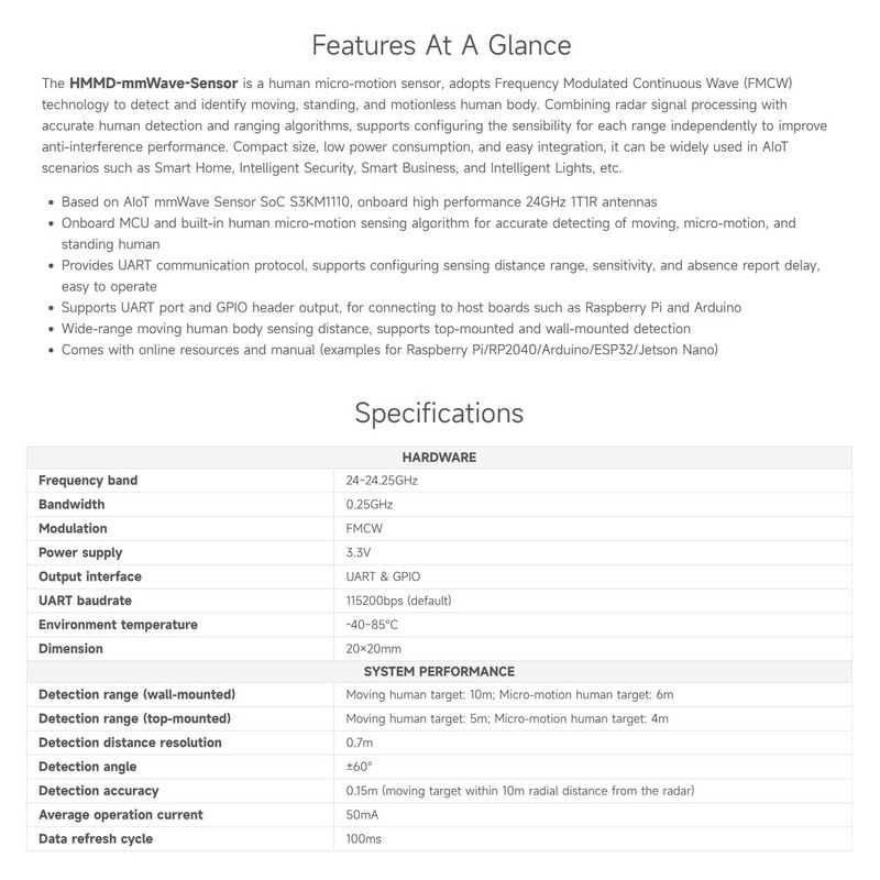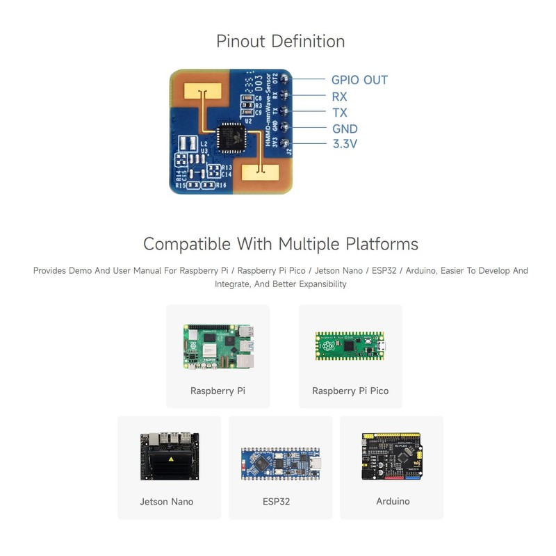 - Supports UART port and GPIO header output, for connecting to host boards such as Pi. Wide-range moving human body sensing distance, supports top-mounted and wall-mounted detection