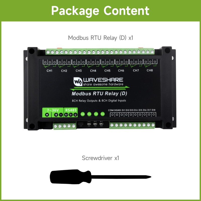 Waveshare Industrial Modbus RTU 8-Ch Relay Module (D) With Digital Input And RS485 Interface, Multi Isolation Protection Circuits, 7~36V Power Supply
