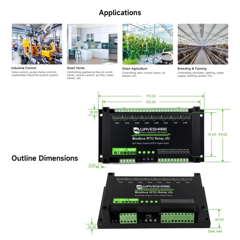 Waveshare Industrial Modbus RTU 8-Ch Relay Module (D) With Digital Input And RS485 Interface, Multi Isolation Protection Circuits, 7~36V Power Supply
