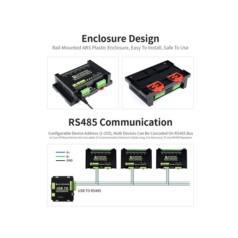 Waveshare Industrial Modbus RTU 8-ch Relay Module with RS485 Interface Multi Isolation Protection Circuits Comes with an ABS Enclosure