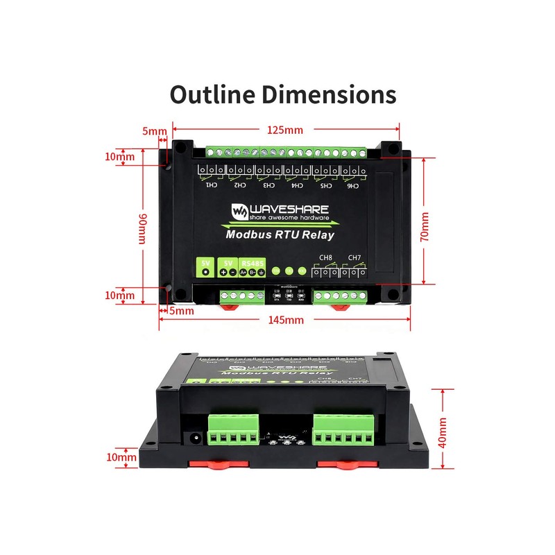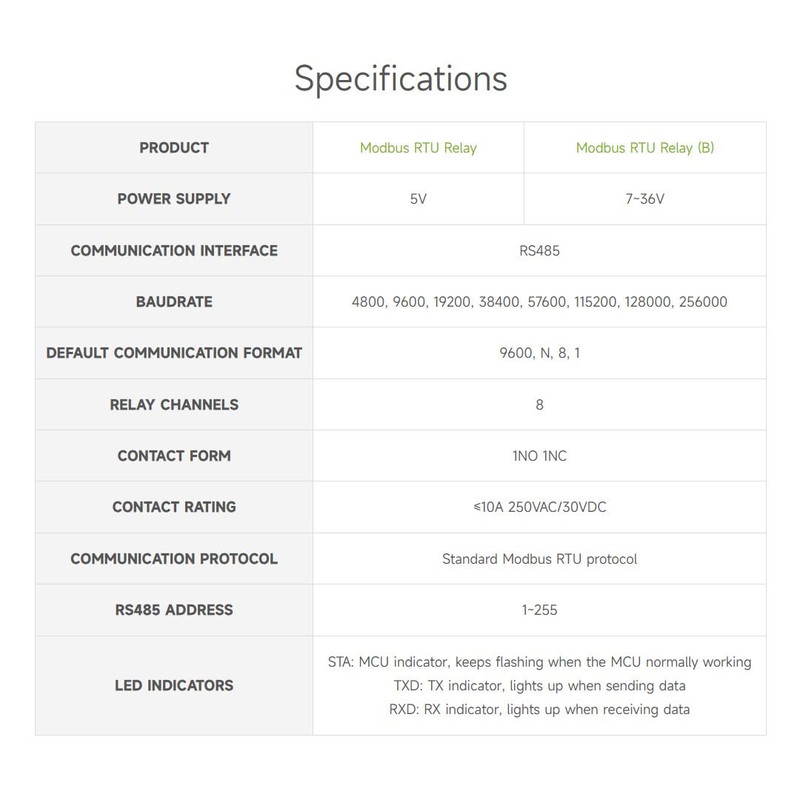 The Modbus RTU Relay is very easy to use. Due to its fast communication, stability, reliability, and safety, it is an ideal choice for industrial control equipments and/or applications with high communication requirement.