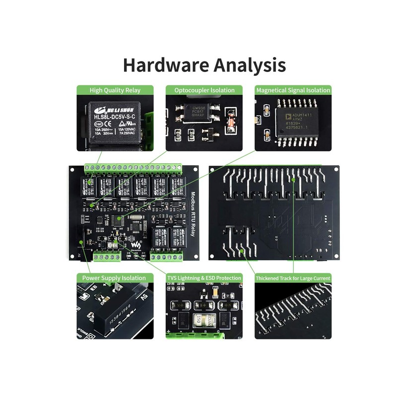 • Onboard TVS (Transient Voltage Suppressor), effectively suppress surge voltage and transient spike voltage in the circuit, llgthningproof & anti-electrostatic. Onboard Optocoupler isolation, prevent interference from external high-voltage circuit connected to the relay
