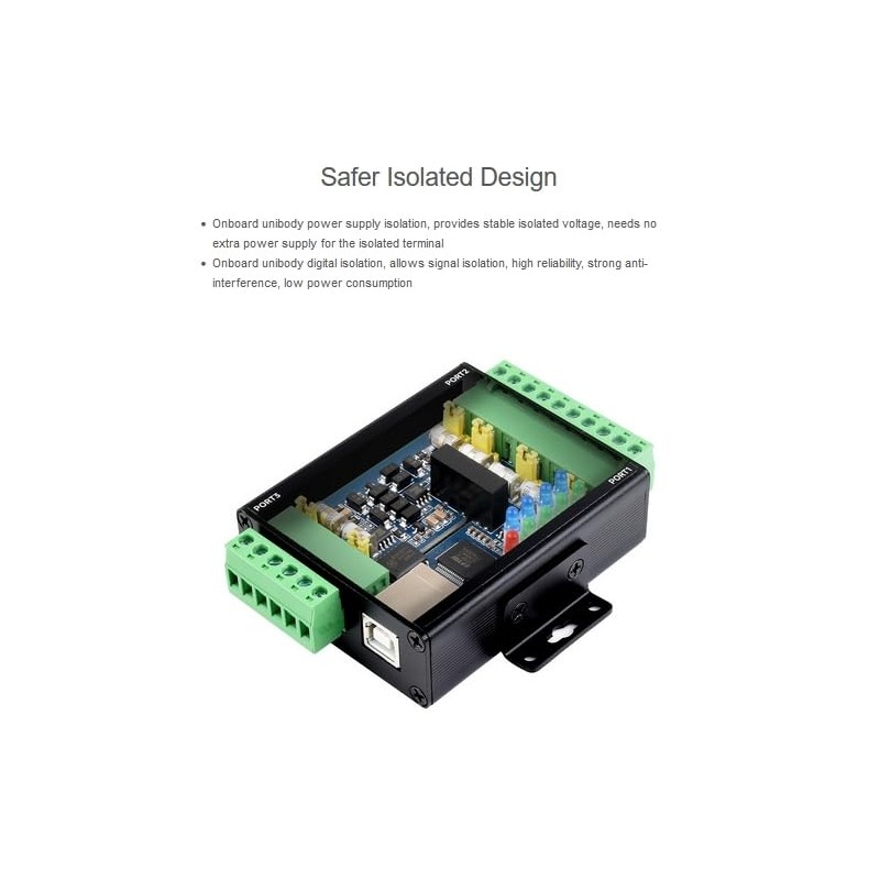- Onboard unibody power supply isolation, provides stable isolated voltage, needs no extra power supply for the isolated terminal. Onboard unibody digital isolation, allows signal isolation, high reliability, strong anti-interference, low power consumption.