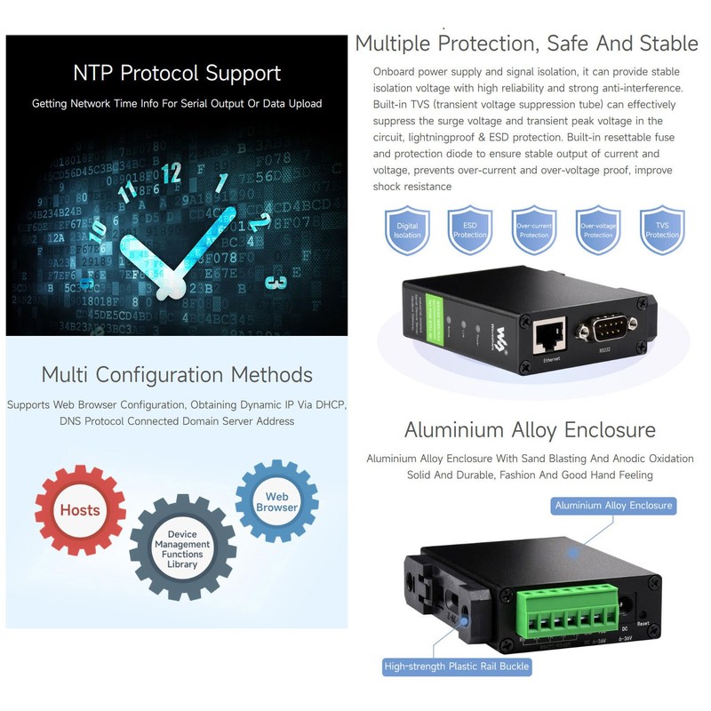 - Supports TCP server / TCP client / UDP mode / UDP multicast. Multi hosts roll-polling support,different network devices will be identified and responsed respectively. No more crosstalk issue while communicating with multi network devices.