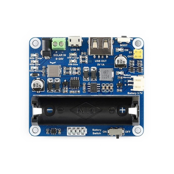 This solar power management module is designed for 6V~24V solar panel. It can charge the 3.7V Li rechargeable battery through solar panel or USB connection, and provides 5V/1A regulated output.