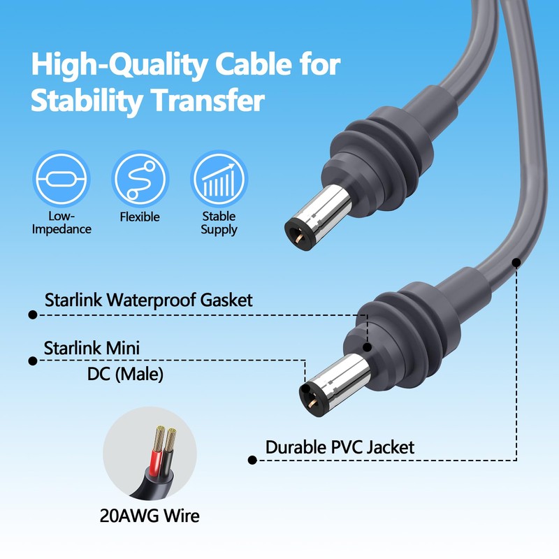 - Fast, Stable Power & Data Transmission:Crafted with premium 20AWG wire, this Starlink Mini dc cable provides high-speed power and reliable data transfer—even in remote or off-grid locations. Get dependable performance wherever your Starlink Mini takes you