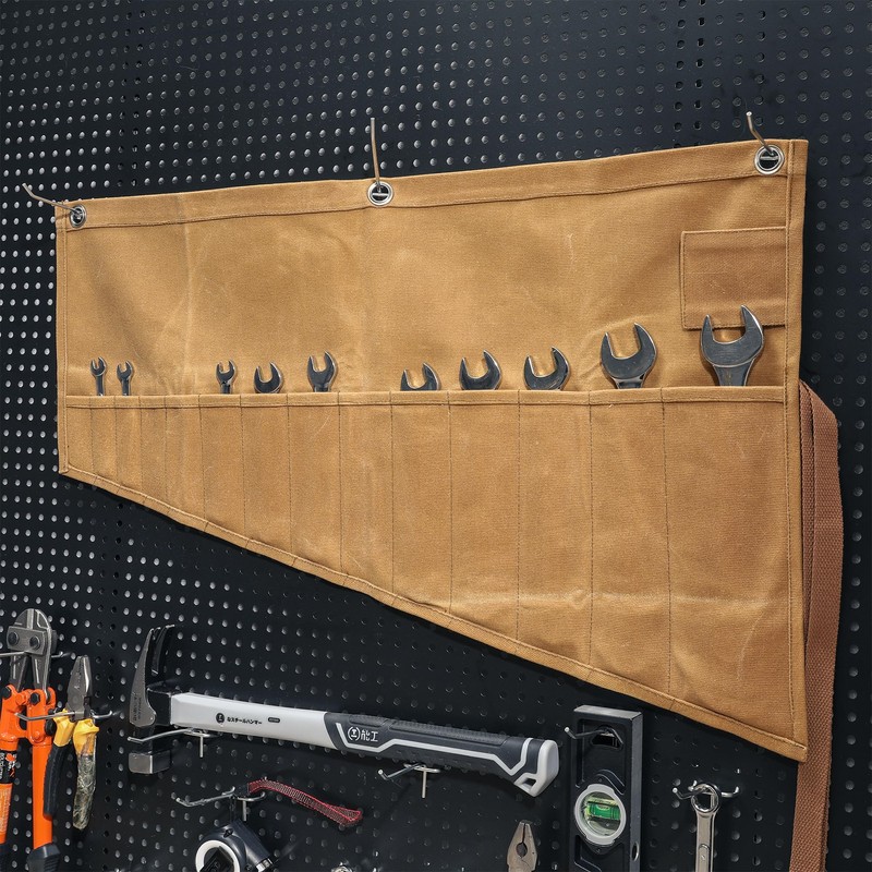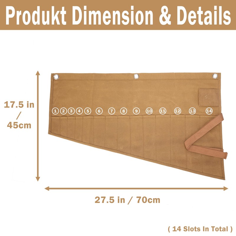 • 14 pockets: the tool roll has 14 pockets in different sizes and is accessible for metric wrenches, SAE, adjustable wrenches and Allen keys and other hand tools.
