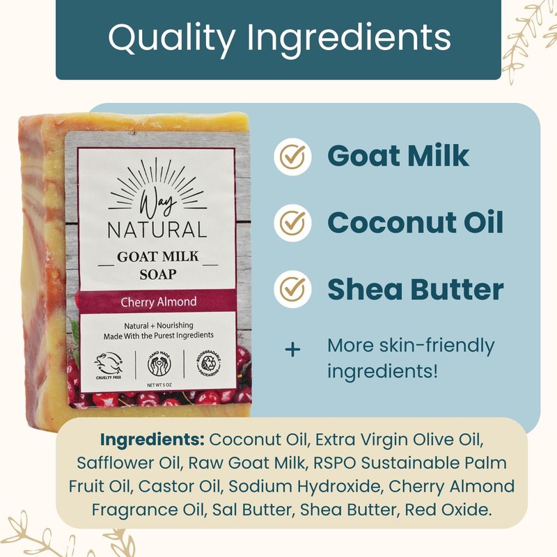 Way Natural Goat Milk Soap Bar, Cherry Almond (3 Pack) - Premium, Handmade w/Real Milk in USA - Hand & Body Goat Soap - Dry Skin, Gentle, No Dyes - (Large, 5oz)