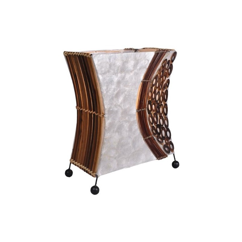 - Brings a very special flair: the very elaborate and lovingly designed table lamp with the smallest handmade parts made of bamboo rings, bamboo strips and leaf spikes, is approx. 30 cm high and rectangular in shape. The light body covered with capis discs underlines the beautiful overall composition