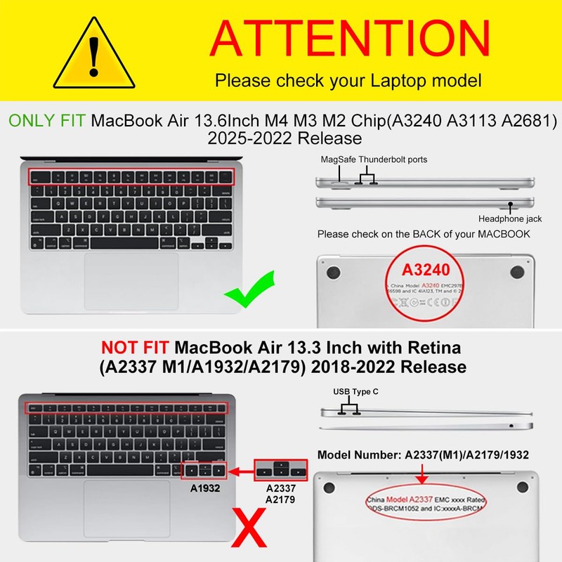 - Compatibility:Compatible with MacBook Air 13.6 inch M2 M3 M4 Chip (2022 2023 2024 2025 Release) A2681 A3113 A3240. Not compatible with other models. Please check the model number on the back of the laptop before purchasing.