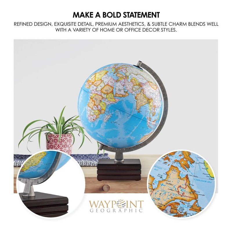 The Aviator globe by Waypoint Geographic features an up-to-date 12-inch Blue Ocean globe with Silver finished metal and numbered meridian. What sets Waypoint maps apart from others is the level of ocean detail within the cartography, showing off many ocean floor features not shown or identified on most globes. The political boundaries and named places contained on the globe are current and updated with each production cycle, ensuring you receive the most updated product available. The stacked three layer square wood base compliments the globe which can be used for reference and decor for the home or office.