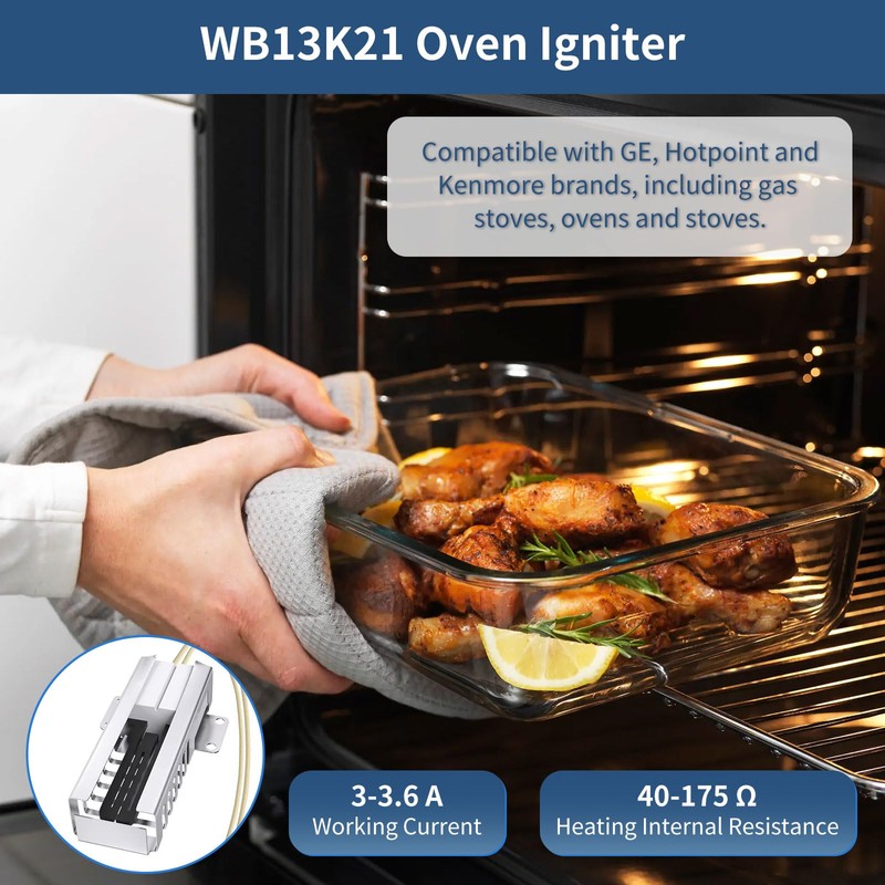 - [Wide Compatibility]: The wb13k21 igniter is compatible with GE, Hotpoint and Kenmore brands, including gas stoves, ovens and stoves. Compatible with the following product models: For GE: JGBS23GEV6AD JGBS23GEV6WH LGB126GEV3AD LGB126GEV3WH LGB146GEV5AD; For Hotpoint: RGB525ET4WW RGB525PEA1WW RGB528GEV3AD RGB528GEV3WH RGB535GEV4AD; For Kenmore: 36261128894 36261128895 36271112000 36271112001 36271161691 36271171890 36271171891. Tip: including but not limited to the above models. For uncertain models, please refer to the product details page or consult us!