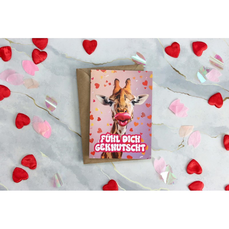 - CHARMING DESIGN The card features a giraffe with lush kissing lips, playfully presented against a background full of hearts. This original and loving design, crowned with the saying "Fühl dich geknutscht", makes the card a real eye-catcher and conveys a message of affection and joy.